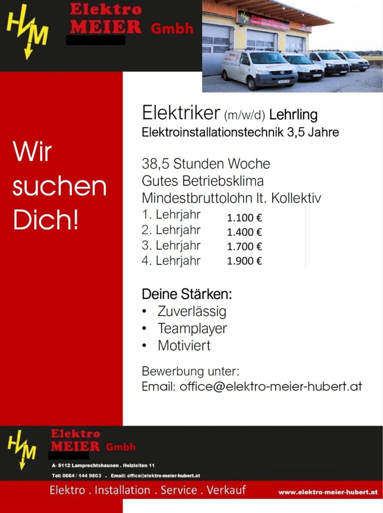 Bewerbung per Email office@elektro-meier-hubert.at oder unter der Telefonnummer 0664/1449803.